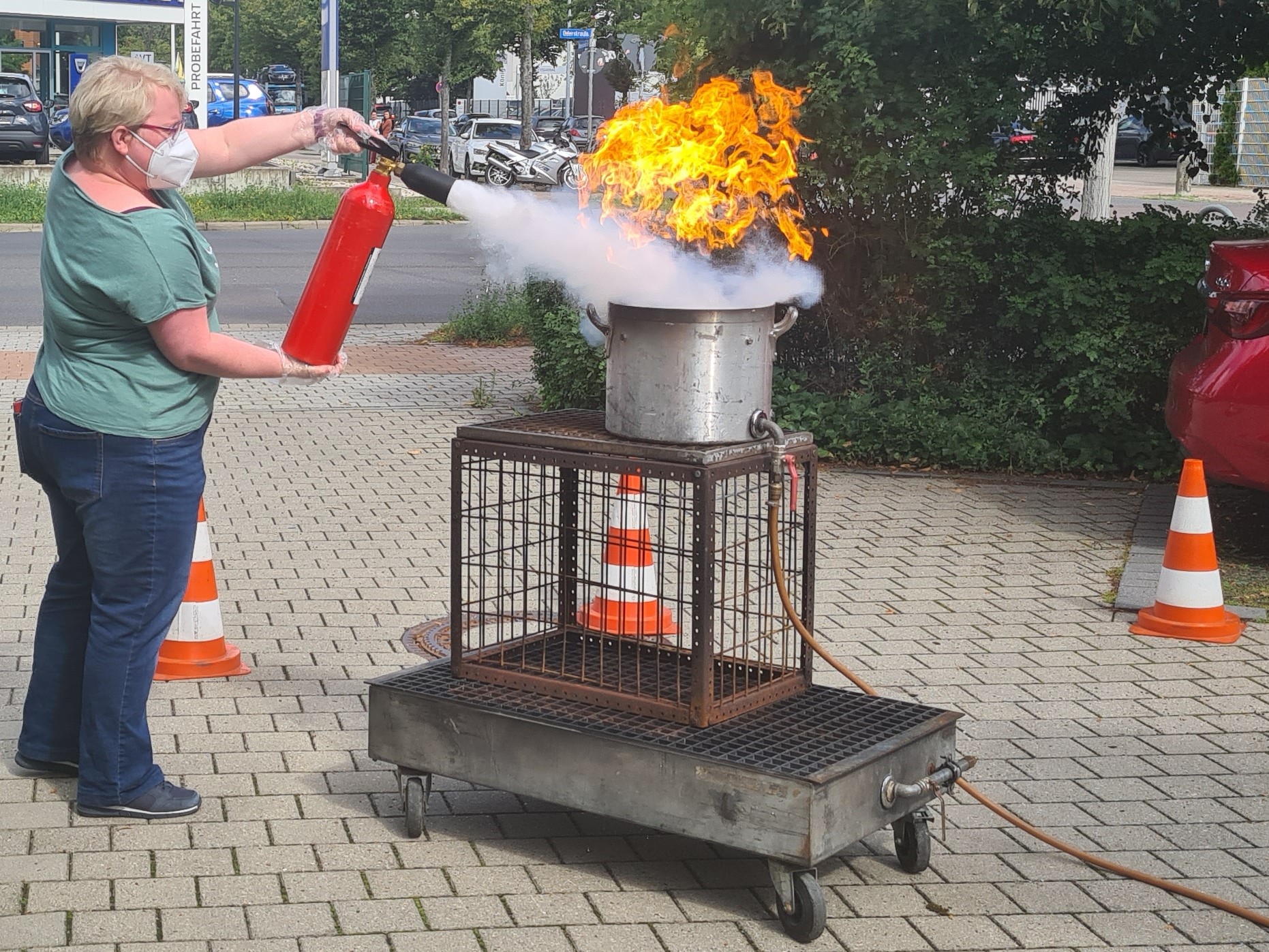 Die Mitarbeiter und Mitarbeiterinnen der ABIT Ingenieure Dr. Trautmann GmbH, sonst vorrangig in der Planung des vorbeugenden Brandschutzes tätig, übten die Brandbekämpfung in der Praxis.