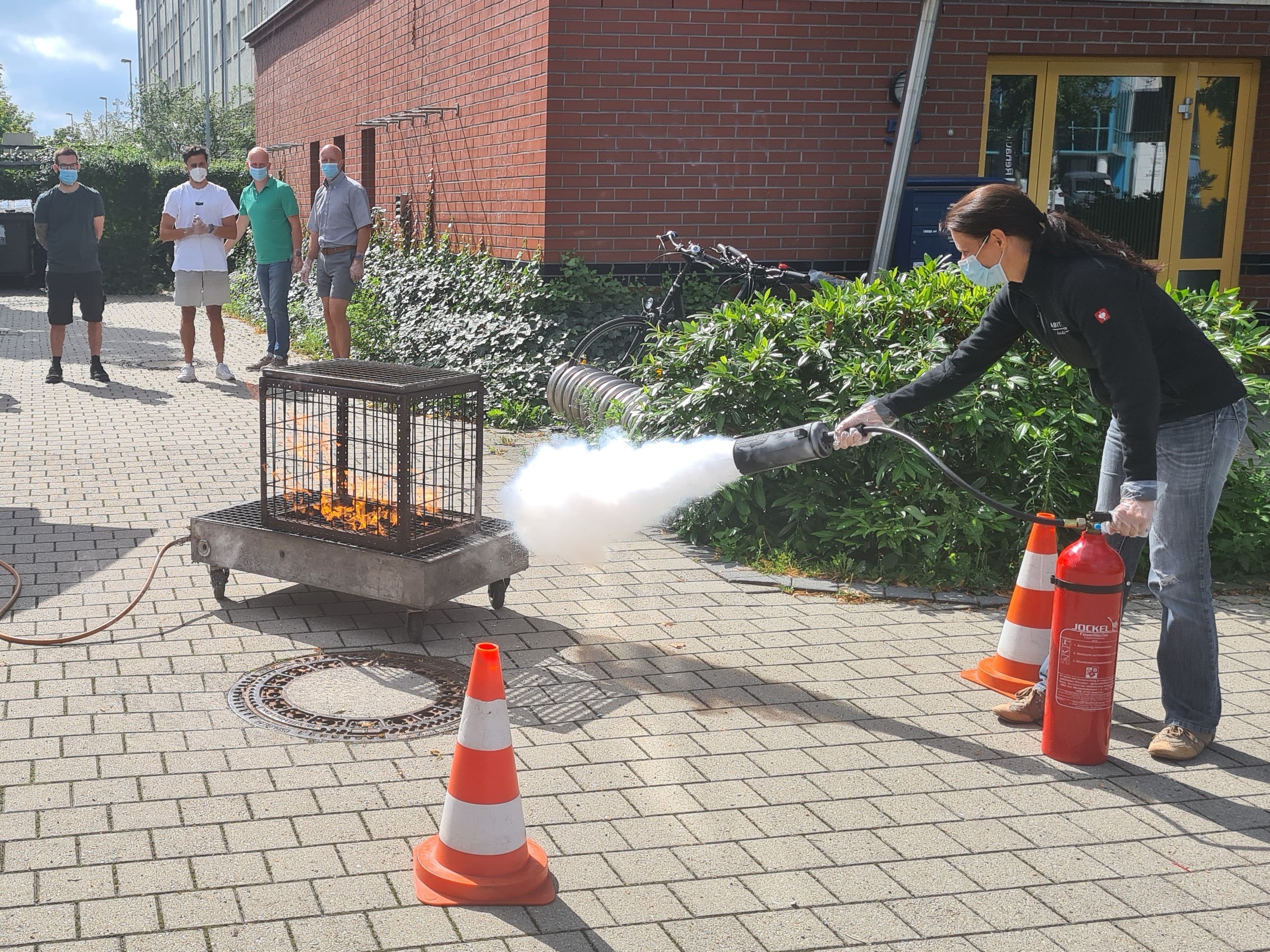 Dann durften alle selbst den Ernstfall üben und einen echten, aber kontrollierten Brand löschen. Für die meisten unserer Mitarbeiter und Mitarbeiterinnen war dies die erste Benutzung eines Feuerlöschers, ein Umstand der im Ernstfall viel wertvolle Zeit gekostet hätte.